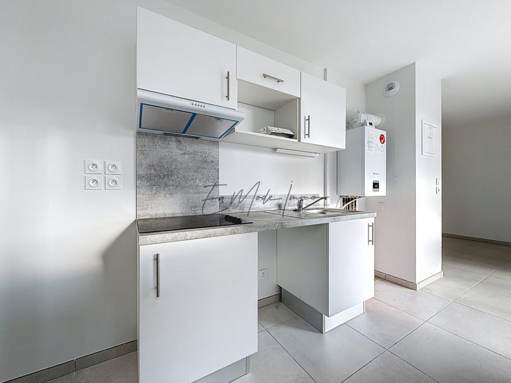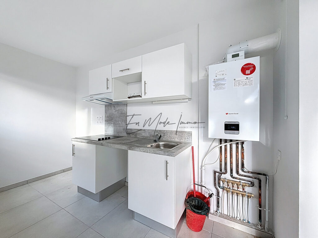 · Cuisine aménagée (plan de travail, plaque vitrocéramique 4 feux, hotte aspirante, évier)