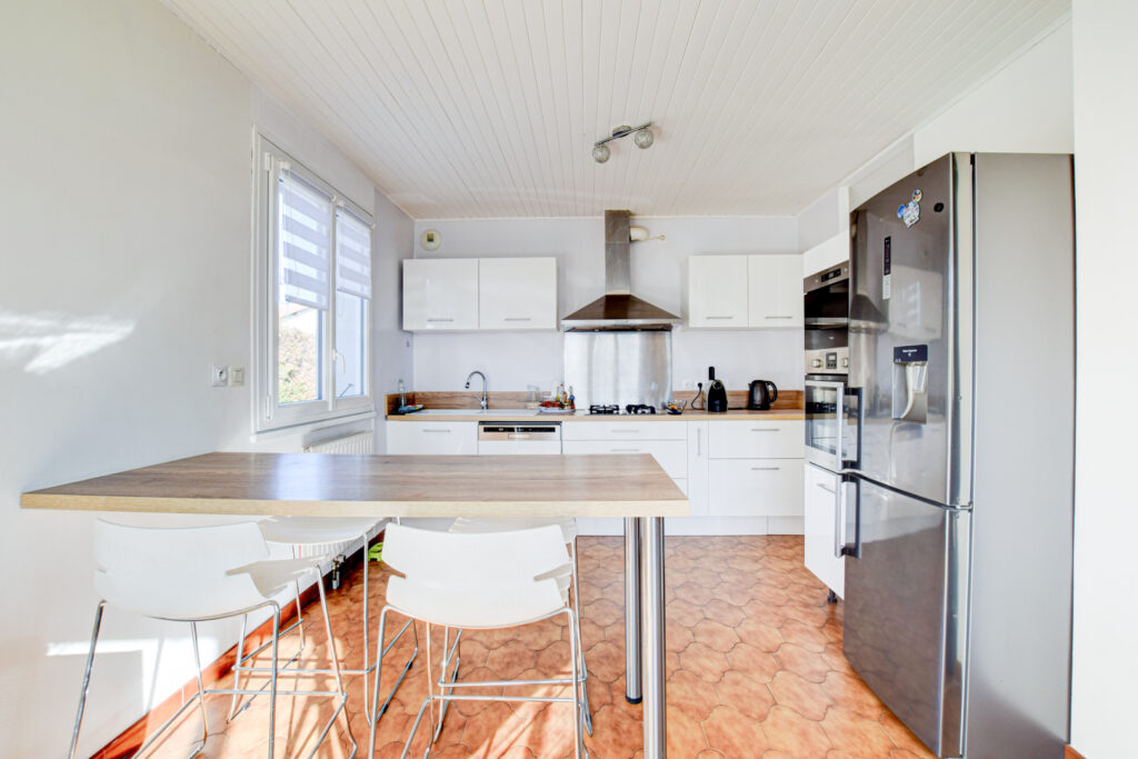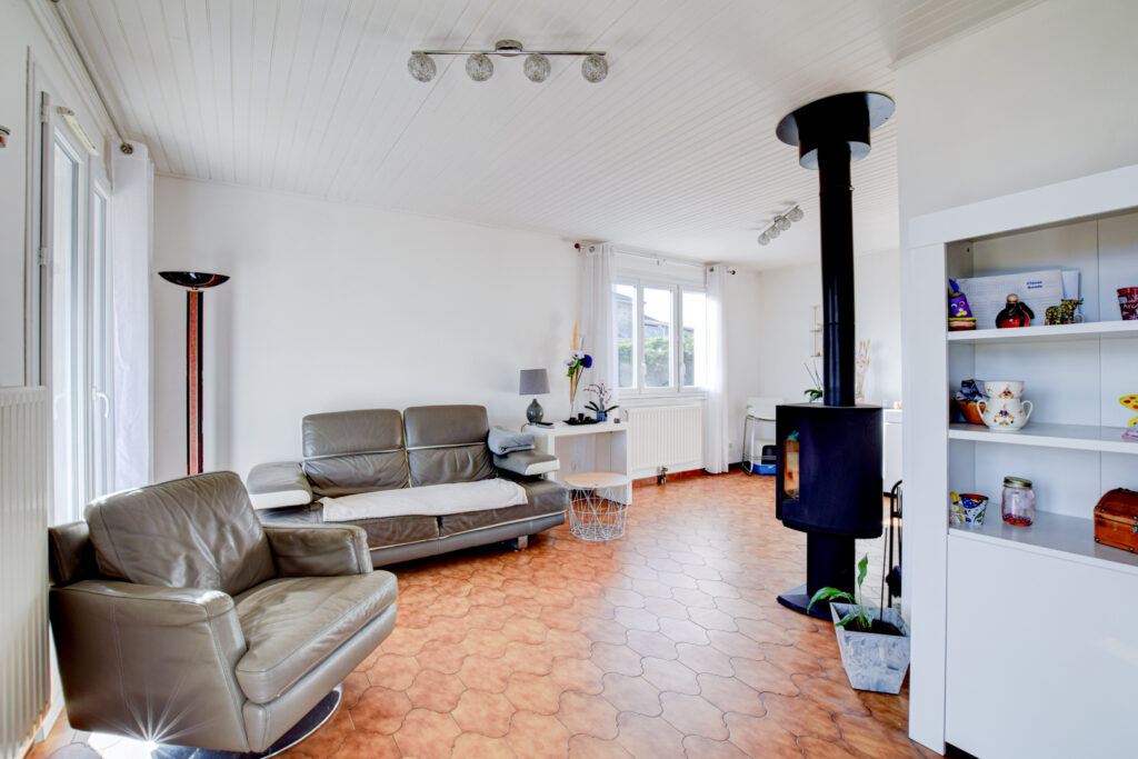 Cuisine équipée ouverte sur séjour : Profitez d’un espace de vie lumineux et chaleureux grâce à un agencement ouvert, complété par un poêle à bois central apportant confort et convivialité.
