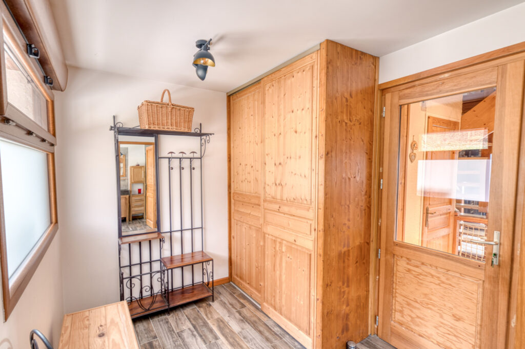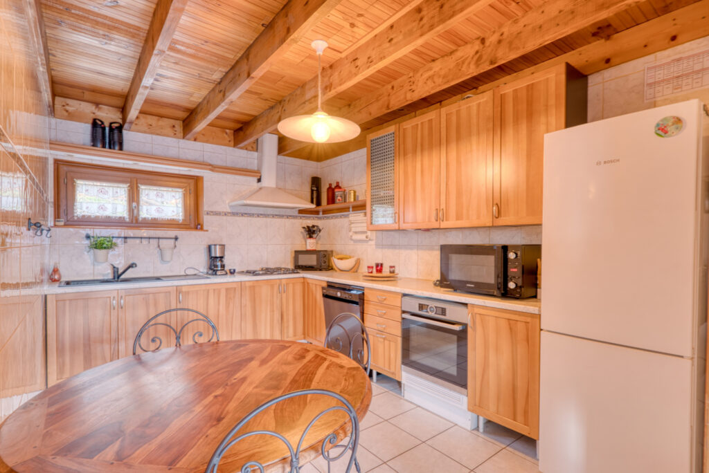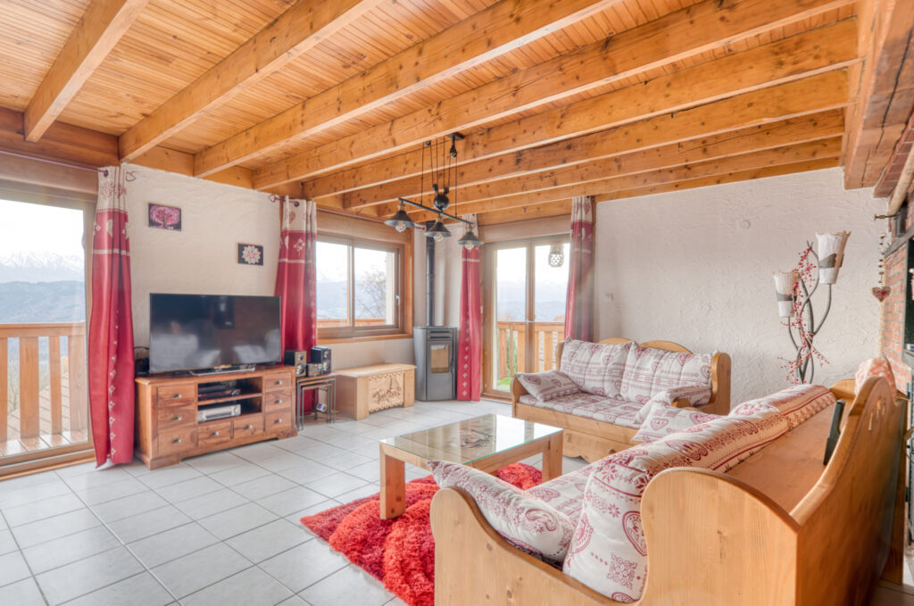 Sa toiture courbe entièrement rénovée en zinc joint debout lui apporte une allure de chalet contemporain, parfaitement intégrée dans le paysage alpin. Orientée pour capter la lumière, elle profite d’une vue dégagée et panoramique sur les massifs.