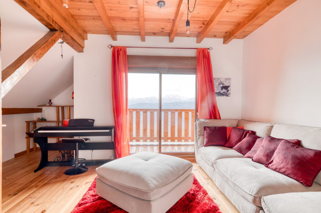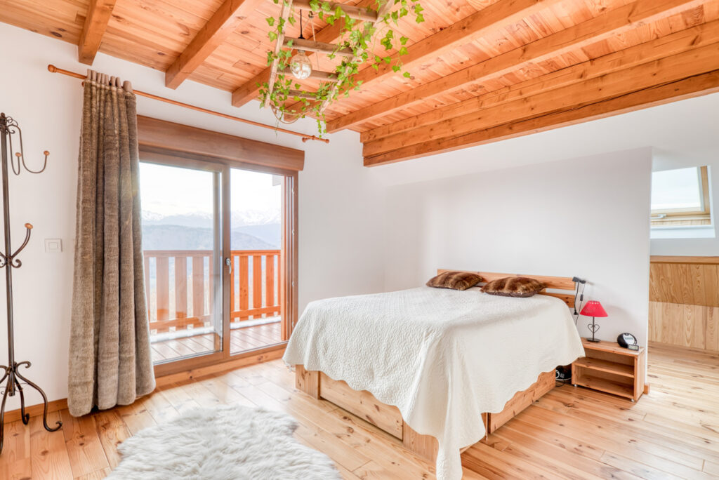 Toutes décorées de chaleureux planchers en bois massif. L’une d’elles, façon suite cocon, bénéficie d’un plafond rampant à poutres apparentes et d’une large baie vitrée coulissante ouvrant sur un balcon avec vue montagne.